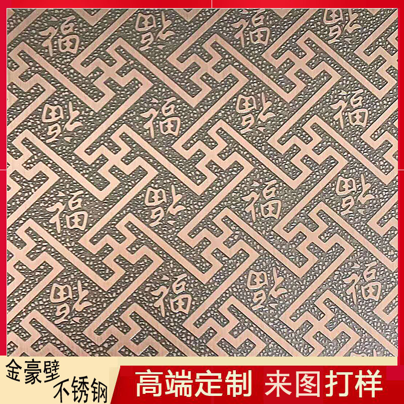 可供選擇的顏色繁多,有玫瑰色古銅色黑色香檳色咖啡色紫紅色寶石藍色青古銅色紅銅色黃銅色等等,應有盡有。可供選擇的外表工藝種類也多種多樣,底板以8K鏡面、拉絲等工藝為主,再加上拉絲、和紋等復雜工藝,使得不銹鋼花紋板的表面紋理清晰、明暗相間,細節(jié)處精美華麗。