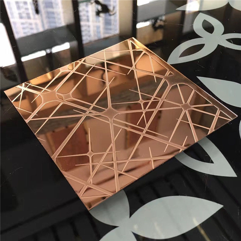 不銹鋼蝕刻板是在不銹鋼表面通過化學的方法,腐蝕出各種花紋圖案。以8K鏡面板、拉絲板、噴砂板為底板,進行蝕刻處理后,對物體表面再進行深加工,不銹鋼蝕刻板可進行局部的和紋,拉絲,嵌金,局部鈦金等各式復雜工藝處理,不銹鋼蝕刻板實現圖案明暗相間,色彩絢麗的效果。