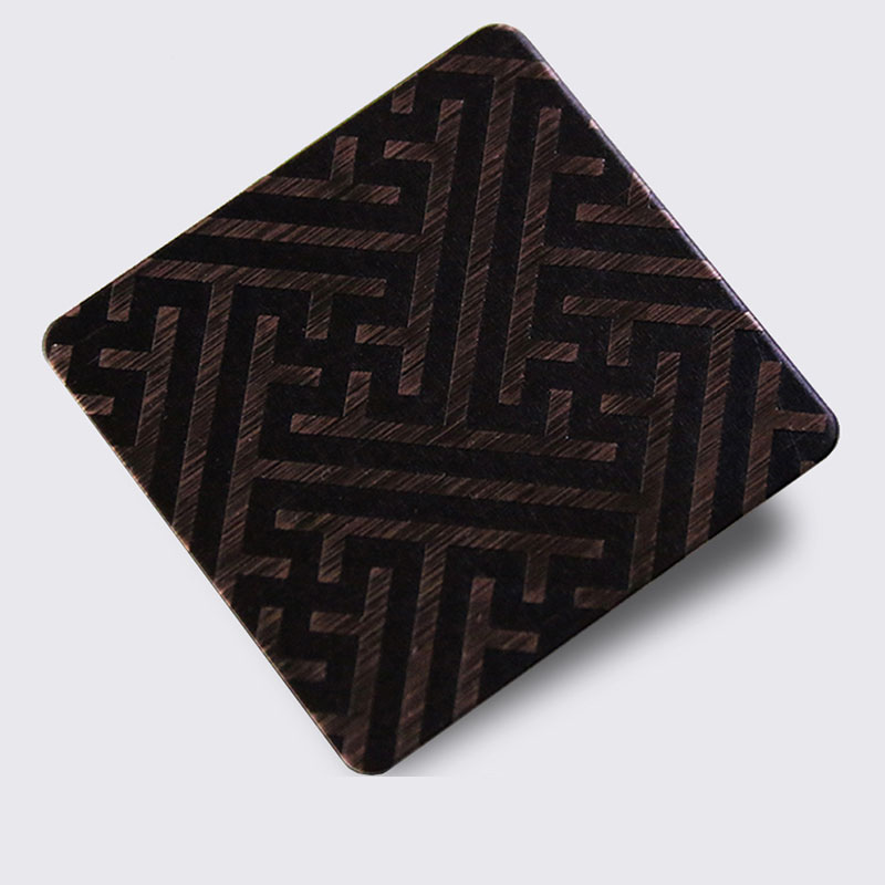 不銹鋼蝕刻板是在不銹鋼表面通過化學的方法,腐蝕出各種花紋圖案。以8K鏡面板、拉絲板、噴砂板為底板,進行蝕刻處理后,對物體表面再進行深加工,不銹鋼蝕刻板可進行局部的和紋,拉絲,嵌金,局部鈦金等各式復雜工藝處理,不銹鋼蝕刻板實現圖案明暗相間,色彩絢麗的效果。